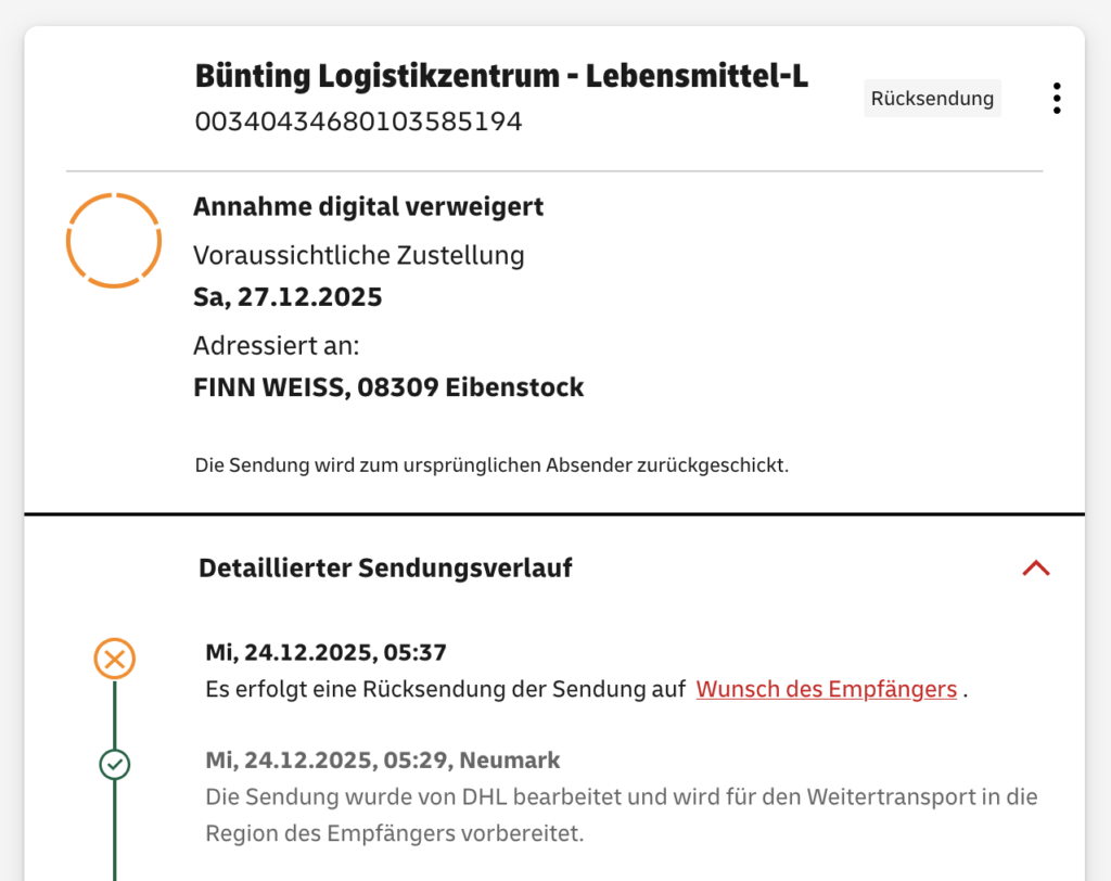 Bitte beachten Sie: Ist die Annahmeverweigerung einmal vermerkt, kann sie weder vom Kundensupport noch von anderen Stellen aufgehoben werden. Das Paket wird anschließend direkt an den Absender zurückgesendet.